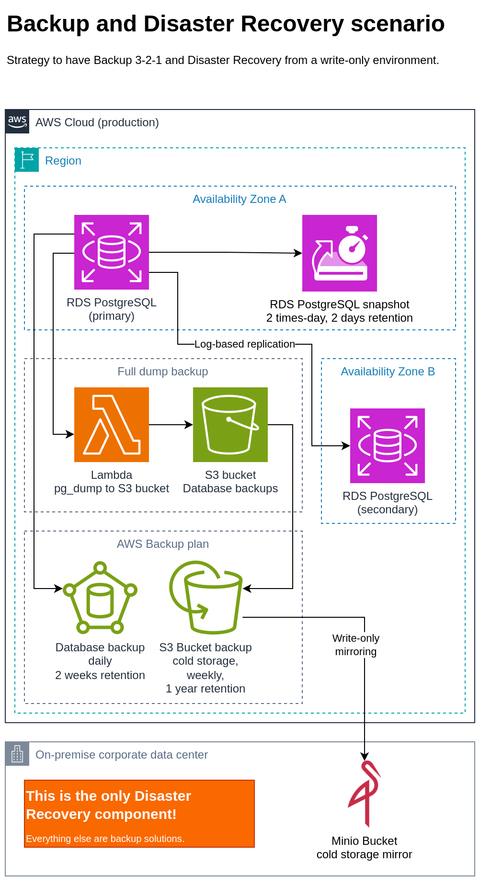 NOTE: this is not a recommended backup strategy for all scenarios. Ideally, the backup should follow at least the Backup 3-2-1 strategy and the one below doesn’t have something equivalent to “different types of storage media”, if you consider the AWS cloud provider as a type of storage media.